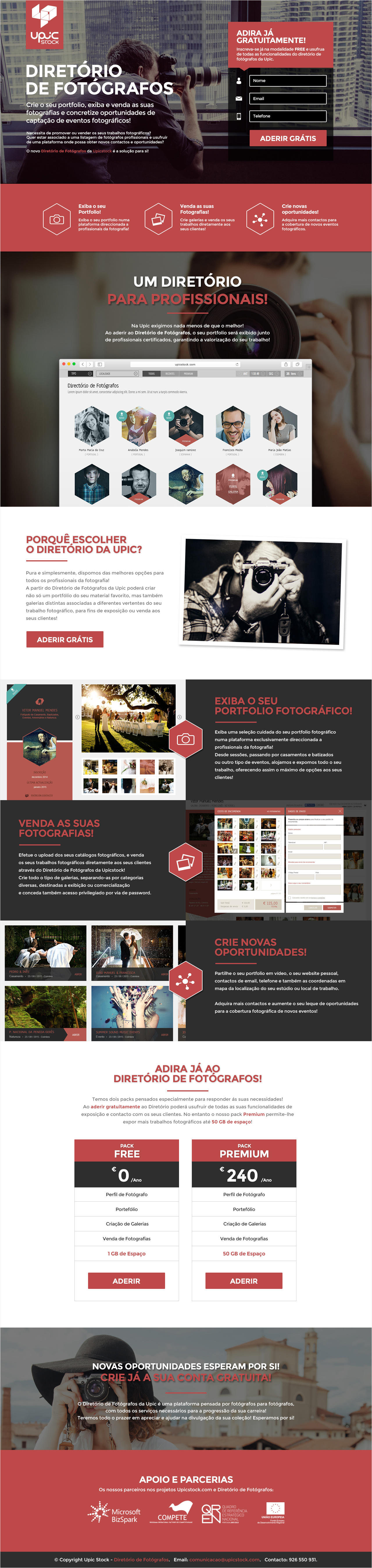 Design e copywriting de Landing Page desenvolvidos em 2015 para divulgação do serviço Diretório de Fotógrafos do banco de imagens português Upicstock. Página desenhada em Photoshop com alguns elementos gráficos desenvolvidos no Adobe Illustrator.