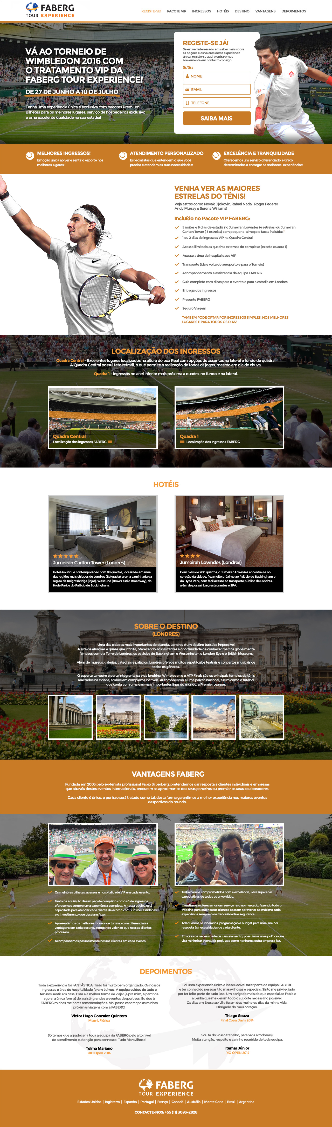 Landing Page desenhada para a Faberg, promotora internacional de turismo associado a eventos desportivos. Página destinada a promover packs turísticos para o torneio de Wimbledon em Londres. Design e foto-montagens elaborados em Photoshop.