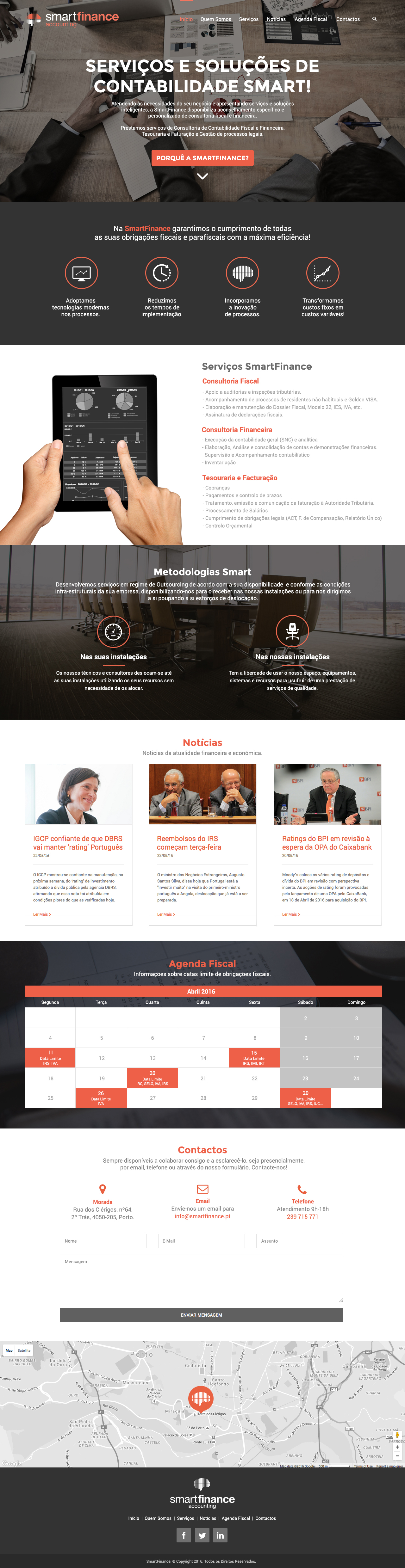 Design de Website desenvolvido em 2016 para a empresa Smartfinance, prestadora de serviços de contabilidade. Página desenhada em Photoshop com alguns elementos gráficos desenvolvidos no Adobe Illustrator.
